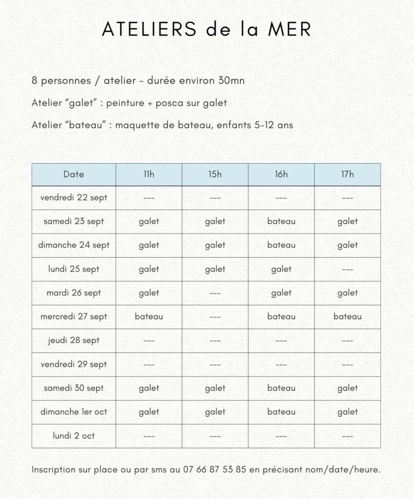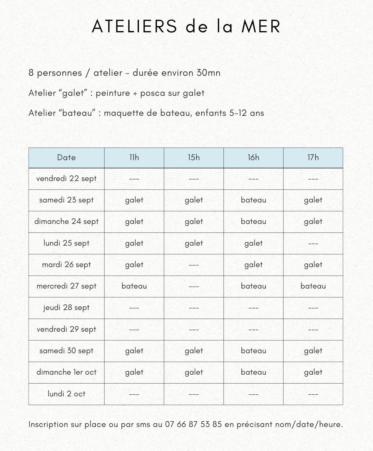 - des ateliers ludiques organisés pour petits et grands, planning ci-dessous