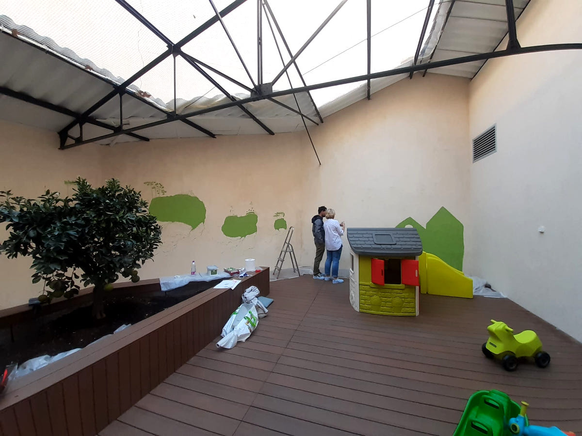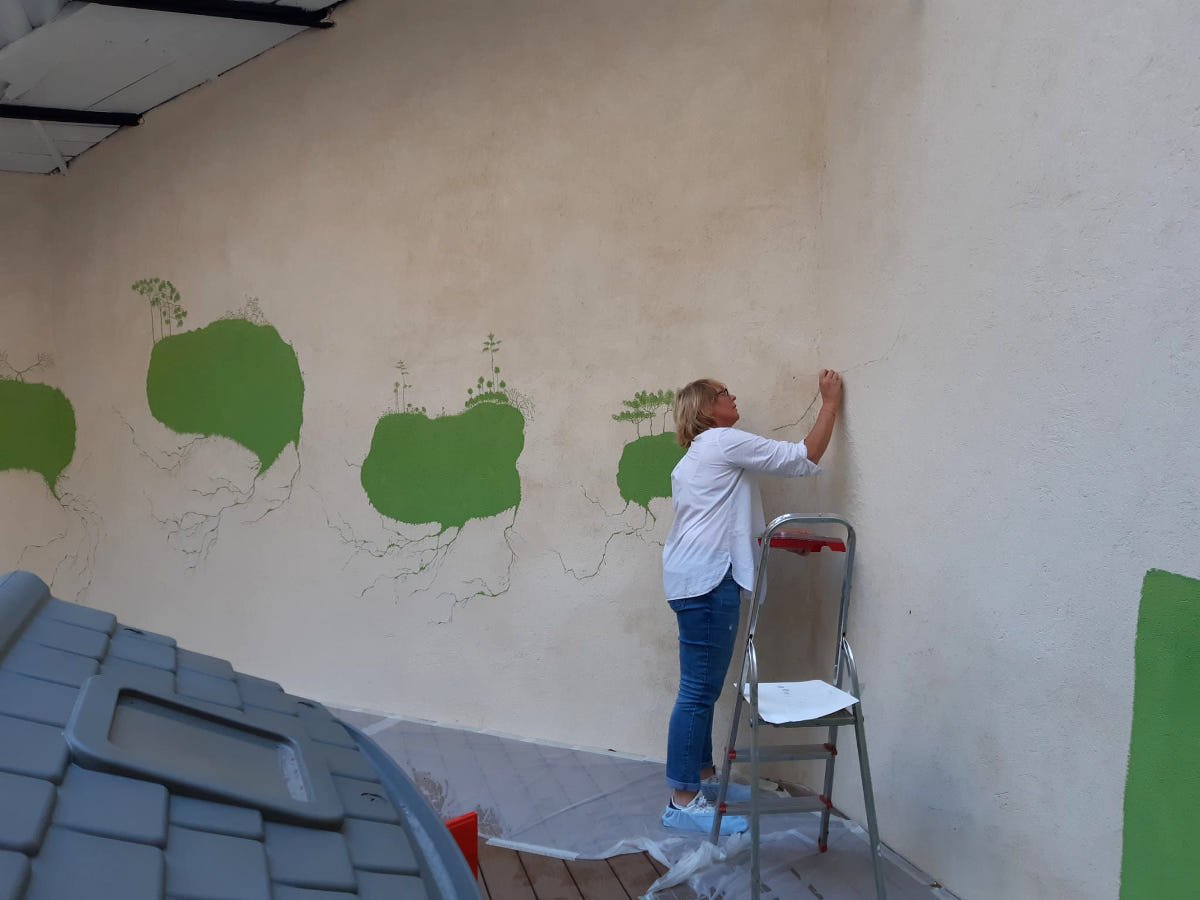 Dans la continuité de son action, après brainstorming avec le personnel et encadrée par la galerie, Nathalie a réalisé une fresque murale extérieure dans l’une des crèches, l’occasion d’un échange supplémentaire avec les enfants et un beau support de communication externe pour le groupe.