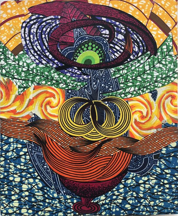 Découpage et collage de tissus WAX sur châssis entoilé 38x46x4cm.