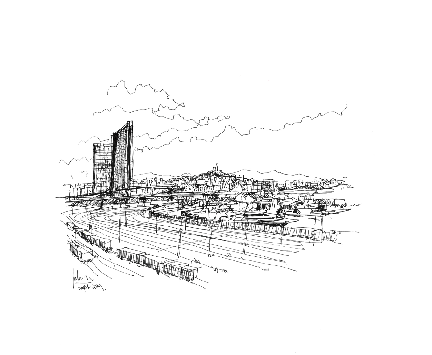 Julien aime noircir les feuilles blanches. Pages vierges comme le support d’un possible, dépositaires de sa sensibilité. Le trait, la ligne, la hachure comme des outils pour l’exprimer. Julien aime désentortiller le paysage -souvent urbain- qu’il lui plaît de contempler.