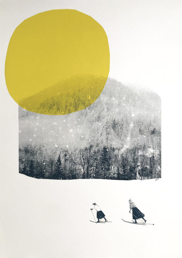 Valérie Betoulaud, Deux Skieuses – jaune, 2021.