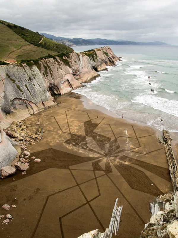 Beach Art. Œuvre improvisée sur la plage de Zumaia en Espagne en 2016, inspirée par les fissures et les mouvement tectoniques de ce haut lieu géologique.