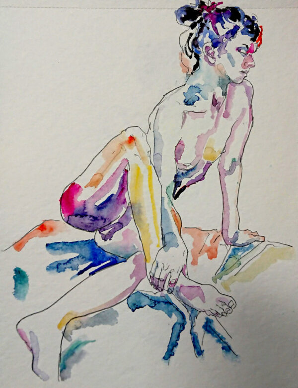 Série « Modèles vivants », aquarelle. Francesca, assise jambes croisées.