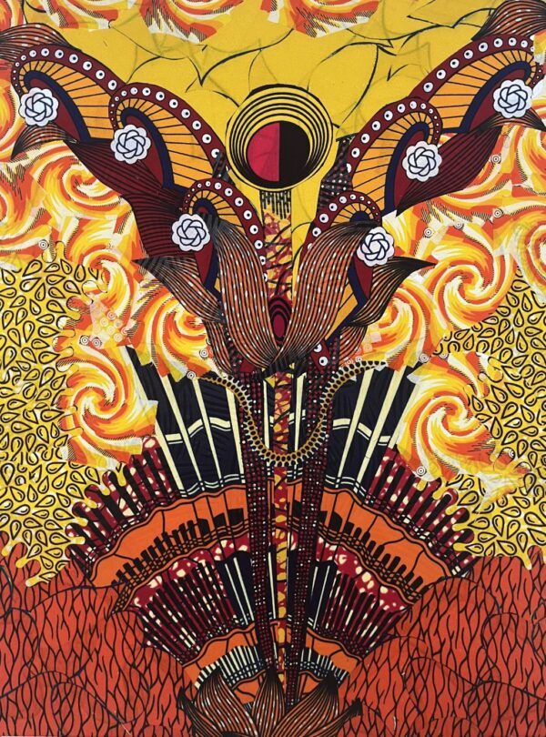 Découpage et collage de tissus WAX sur châssis entoilé 46x62x4cm.