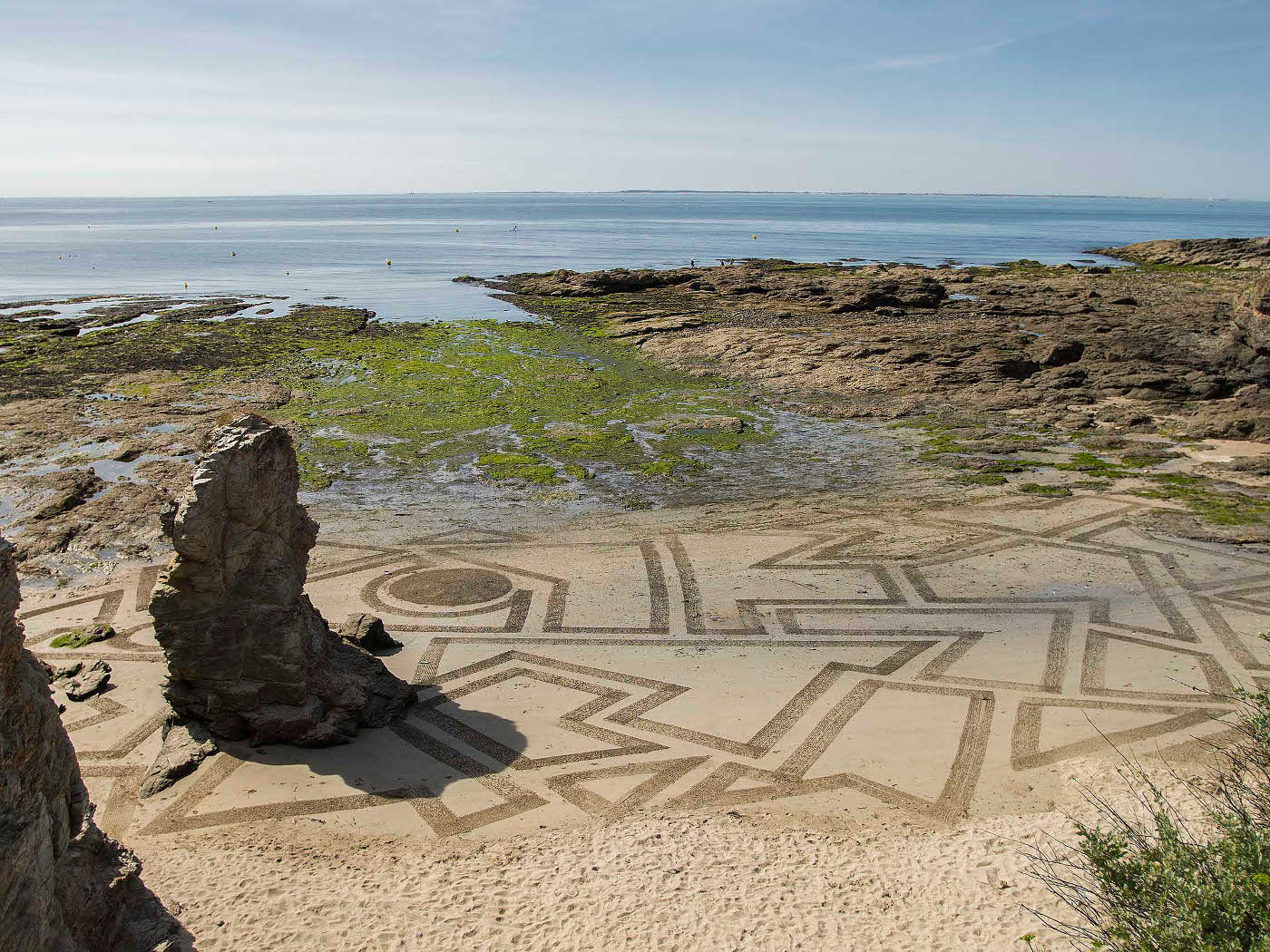 Œuvre improvisée sur une plage de Préfailles en 2016, utilisant cette sorte de monolithe comme point central.