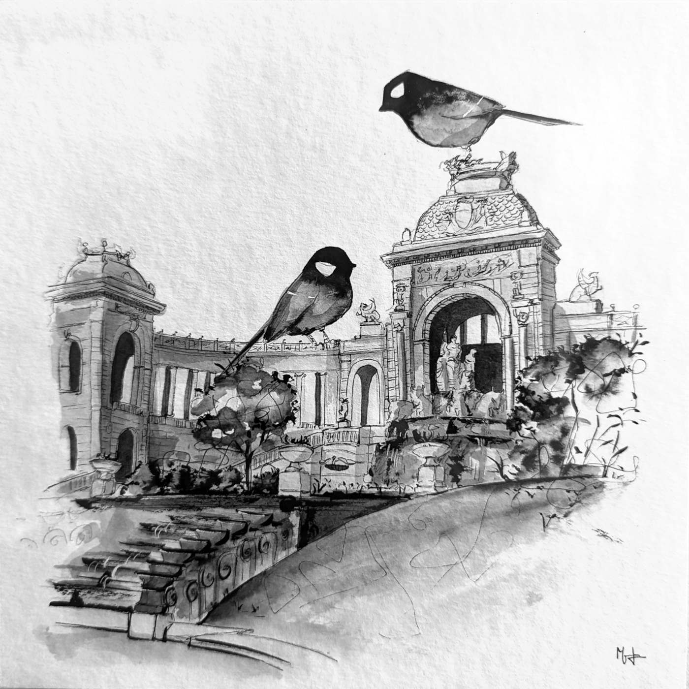 Dans cette encre de Chine, deux mésanges géantes surplombent le parc Longchamp à Marseille. Les jardins luxuriants en dessous ajoutent une touche de douceur à cette scène où l’amour et la nature s’harmonisent.
