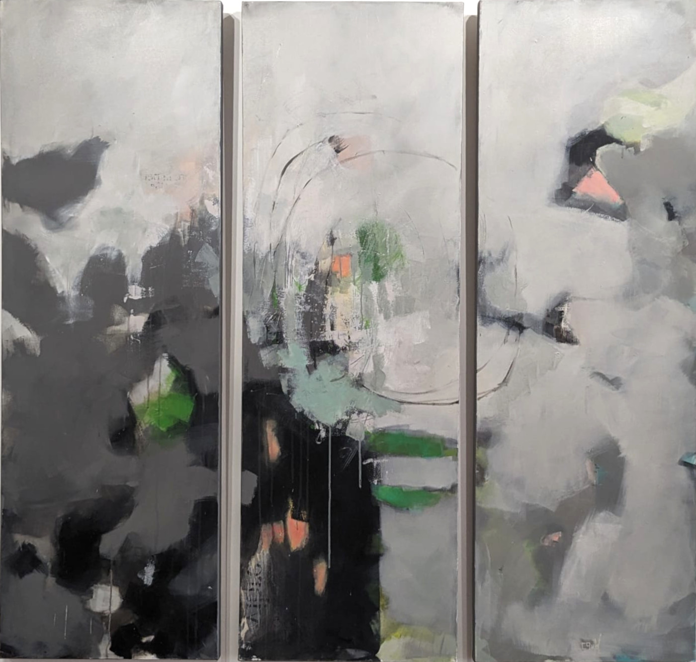 Sur ce triptyque je ressens une présence humaine (l’ombre ou la tache noire qui aurait pu être un personnage mais qui s’est effacée).