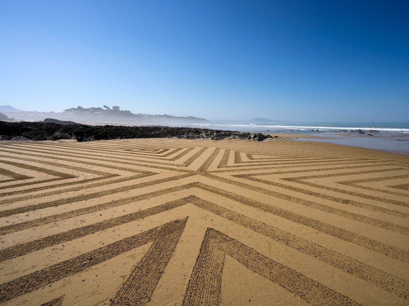 Oeuvre improvisée sur une petite plage de Bidart en 2018, inspirée par les lignes sur les rochers avoisinants et les plaques qu’ils forment.