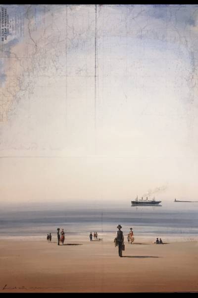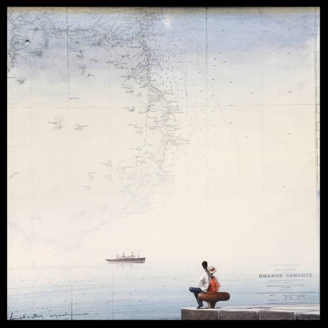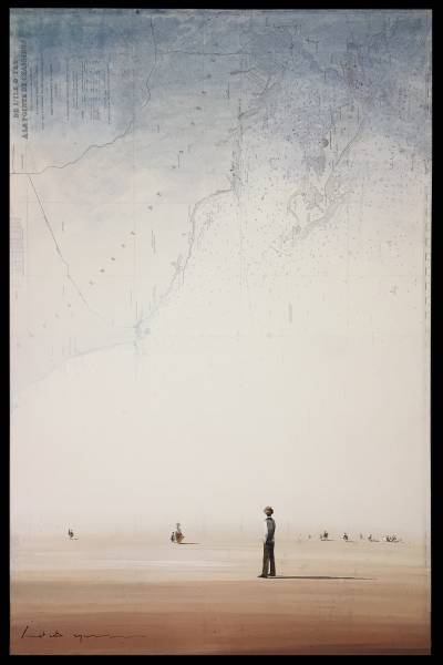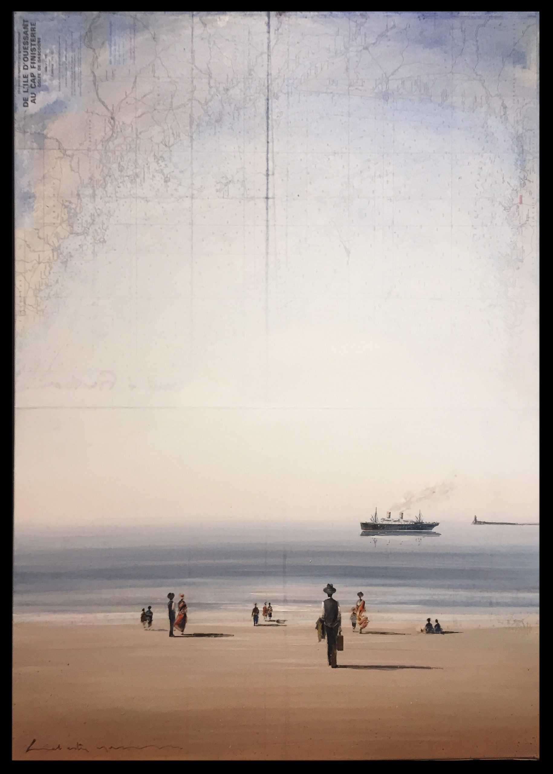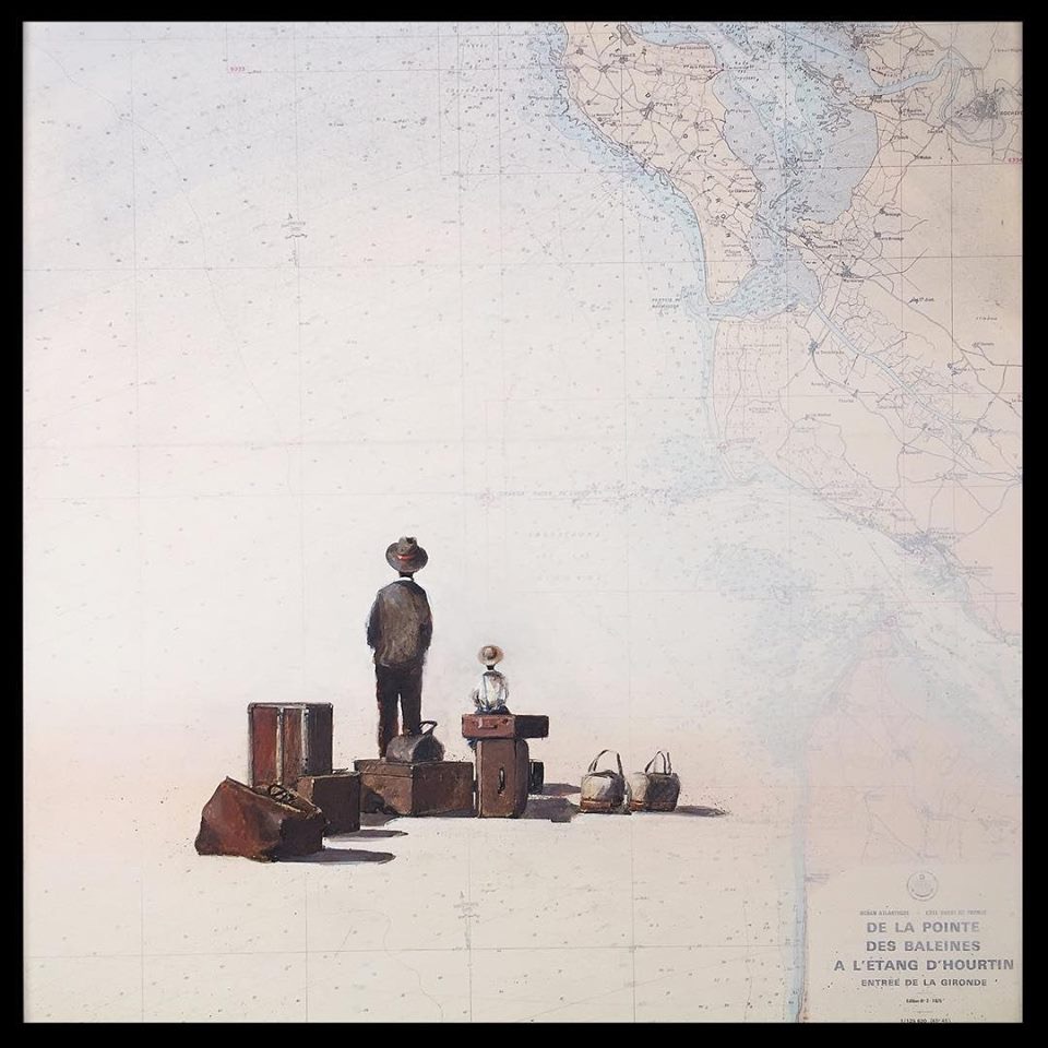 Notre artiste Yann Letestu pose ses petits personnages et ses paysages poétiques sur des cartes marines marouflées, chinées ou apportées par ses clients.